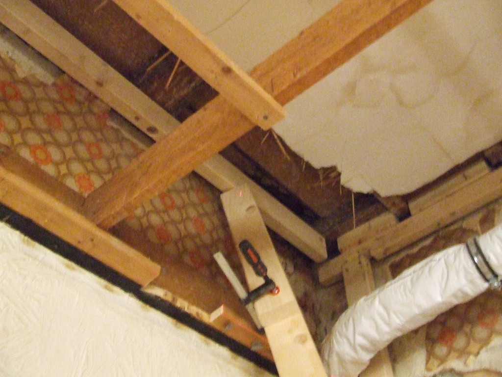 Träger von unten an der Holzbalkendecke, in der Ecke fehlt noch die Verlängerung des Abwasserrohres nach oben.