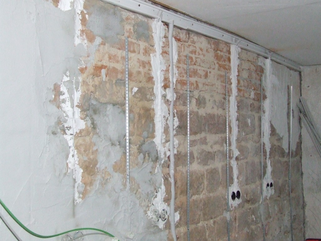 Die noch nicht fertig verputzte Wand mit den Steckdosen für Waschmaschinen und Trockner