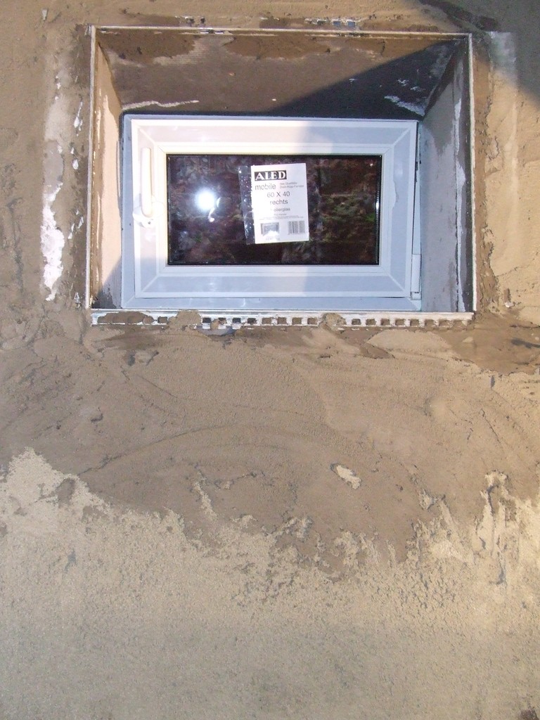 Erste Putzschicht um das neue Fenster herum, Putzleisten fixiert