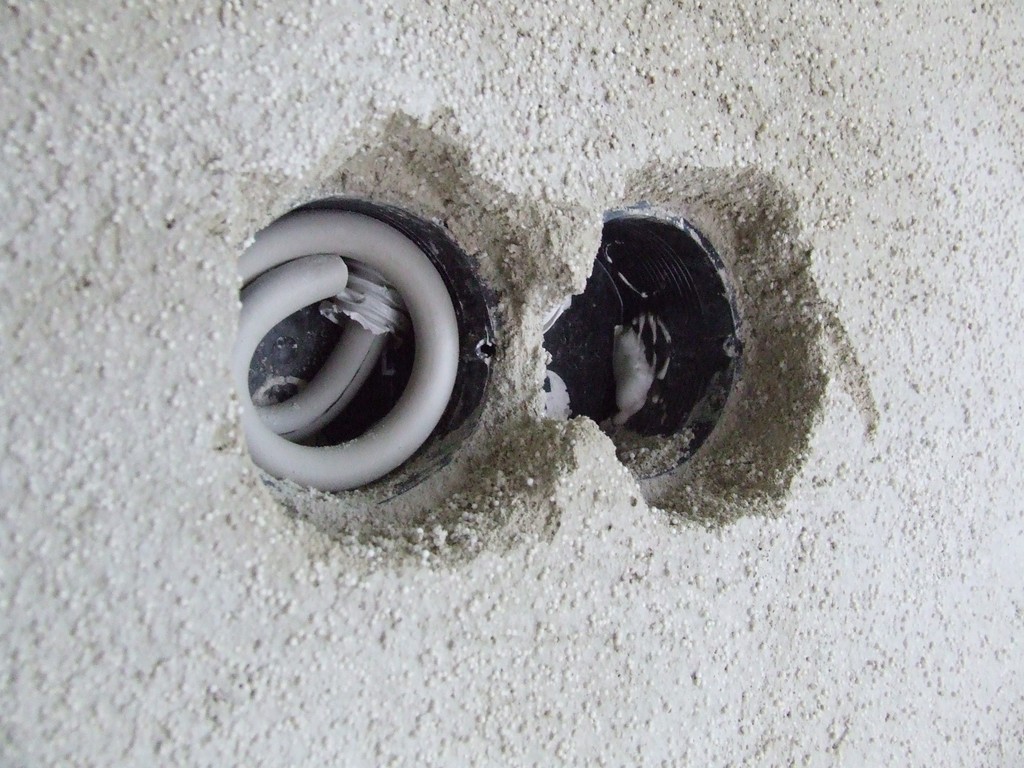Für jedes Großgerät haben wir hier zwei Steckdosen vorgesehen, die jeweils vom an der Decke verlaufenden Kabelkanal mit zwei separaten Wellrohren angebunden sind. Zweck der 2. Dose ist noch unbestimmt, denkbar ist hier Energiemanagement oder ähnliche zukünftige Anwendungen. Der Verputz ist an dieser Stelle der Wand deutlich dicker geworden als erwartet. Ich hatte die Steckdosen etwa 1-2cm aus der Sandsteinwand herausragen, jetzt sind da nochmal rund 2cm mehr Putz darüber gekommen. Die Wand ist durch den Verputz nun vollständig eben und nahezu senkrecht, mir hätte auch gereicht, wenn der Verputz dem Bogen der Wand gefolgt wäre.