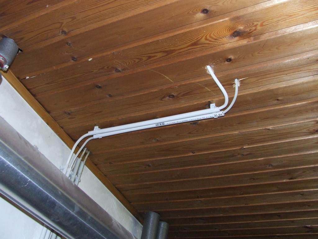 Stromleitung und Erdungsleitung durch die Zwischendecke gezogen und ein Stück mit Installationsrohren M16 bis zur Wand.