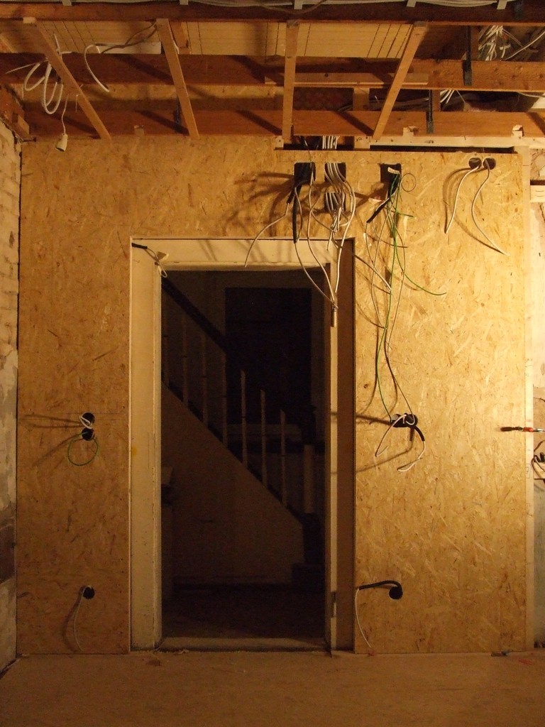Die Westwand in der Küche nach dem Verbau der Platten, die rechte Platte wird nur von einer Zwinge gehalten.