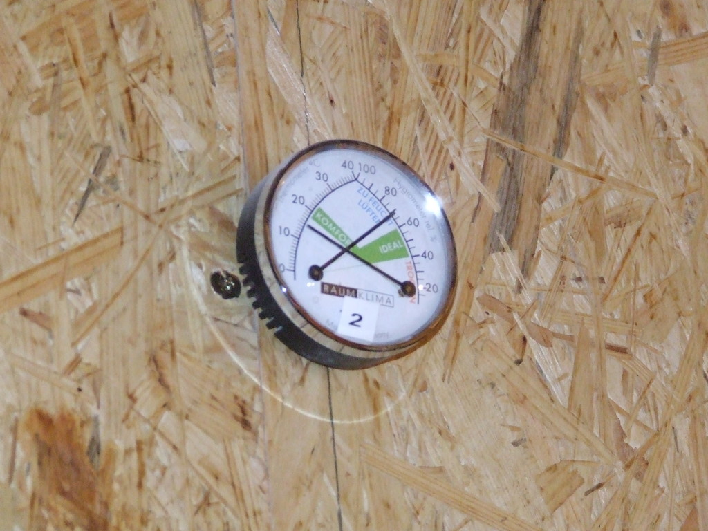 Raumklima Messgerät, 15°C Raumtermperatur genügt, leider etwas zu feuchte Luft vom Verputzen