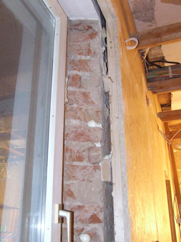 Verputz der Fensterlaibung der Küchennordwand abgeschlagen, Mauer freigelegt