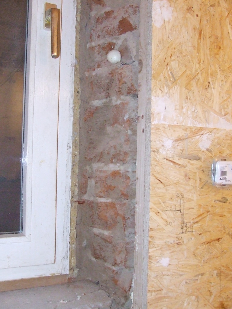 Verputz der Fensterlaibung der Küchennordwand abgeschlagen, Mauer freigelegt