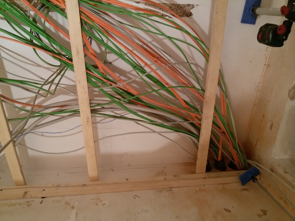 Balken eingebaut, Querlatten draufgelegt und damit die Kabel hochgedrückt. Rechte obere Ecke. der sehr nützliche Nivelierlaser!