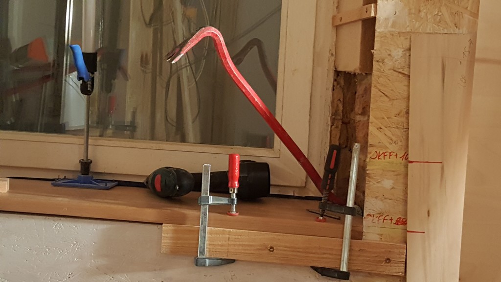 Um zu vermeiden, dass die Fensterbretter auf dem Schaum „Aufschwimmen“, habe ich ein Stemmeisen hinten eingeklemmt, was die Fensterbank durch sein Eigengewicht und Hebelwirkung niderdrückt