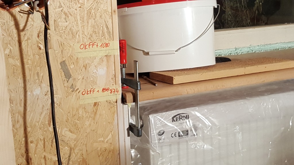 Fensterbrett mit Schraubzwinge am Stützrahmen befestigt, damit das Brett nicht aufschwimmt