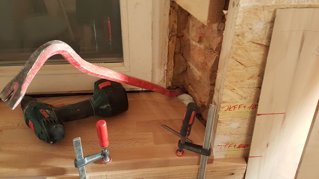 Um zu vermeiden, dass die Fensterbretter auf dem Schaum „Aufschwimmen“, habe ich ein Stemmeisen hinten eingeklemmt, was die Fensterbank durch sein Eigengewicht und Hebelwirkung niderdrückt