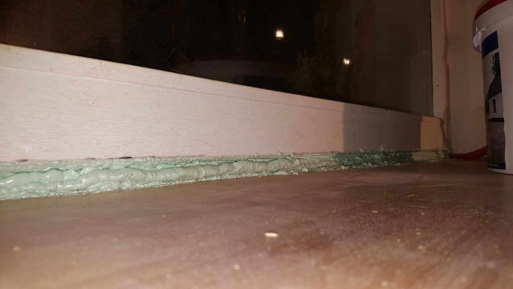 Bauschaum drückt durch den Spalt zwischen Fensterbrett und Fensterrahmen