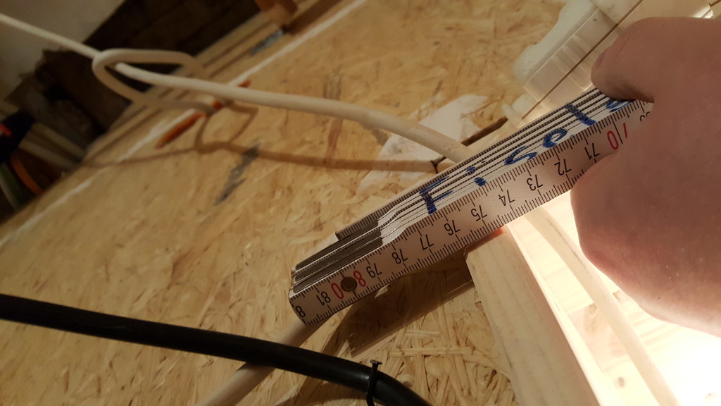 Türbreite oben 747mm. Hier noch sehr deutlich erkennbar, dass die Verkleidung der Türlaibung (Fichtenholzbrett) ca 5-8mm über die Ebene der OSB-Plattenwand hinausragt. Das haben wir später bündig geschliffen und versprachtelt.