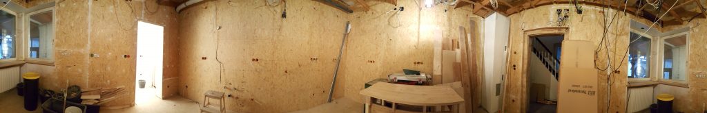 Küche am 23.4.2017, Rundumpanorama von der Raummitte aus, von Nordwest (links) im Uhrzeigersinn bis Nordwest (rechts)