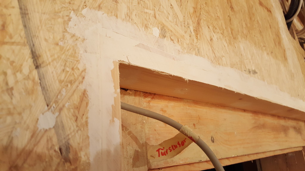 Türrahmen Stand 29.4.2017: Türsturzverkleidung korrigiert und verspachtelt. Außerdem im Bild die Sensorleitung für den Türöffnungssensor