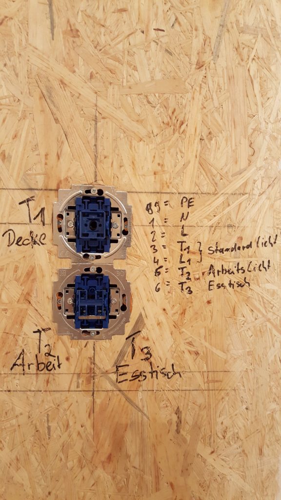 Taster (oben: 1x Deckenlicht T1, unten: Arbeitslicht (T2) und Esstisch (T3)) neben der Küchentür mit Aderbelegung. Hier führt ein NYM-J 7×1,5mm² hin was wie folgt belegt ist: gg=PE, 1=N, 2=L, 3=T1 (1=Deckenlicht), 4=L1, 5=T2 (Arbeitsbeleuchtung), 6=T3 (Esstischbeleuchtung)
