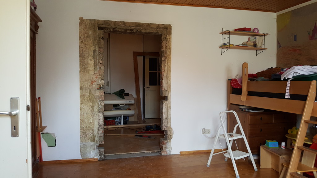 Verbindungstür zum neuen Bad im Kinderzimmer, Tür ausgebaut.