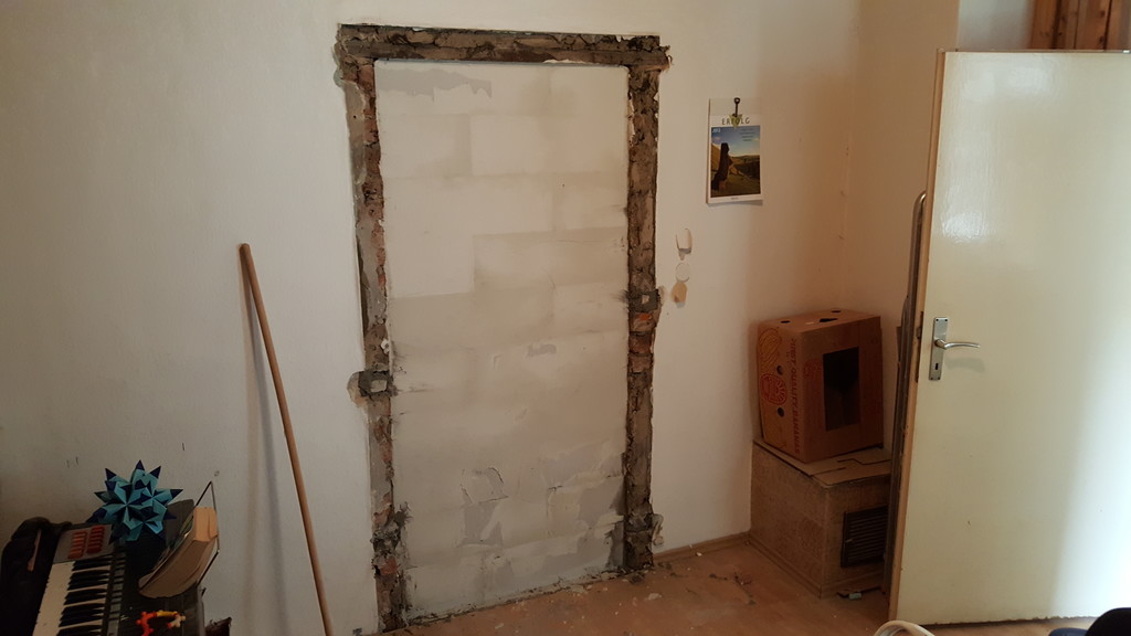 Zugemauerte Verbindungstür vom künftigen Badezimmer aus gesehen.