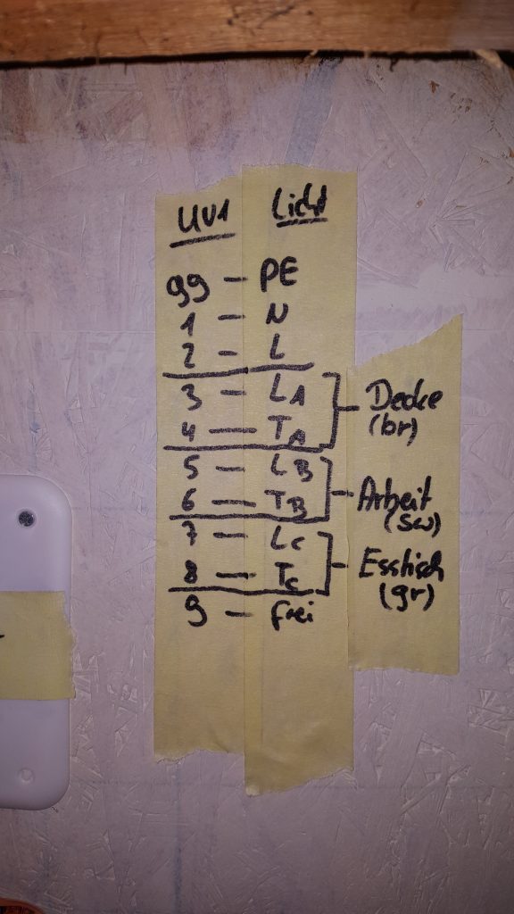 Aderbelegung NYM-J 10×1,5mm² ab UV1, PE,N,L,LA,TA,LB,TB,LC,TC,frei