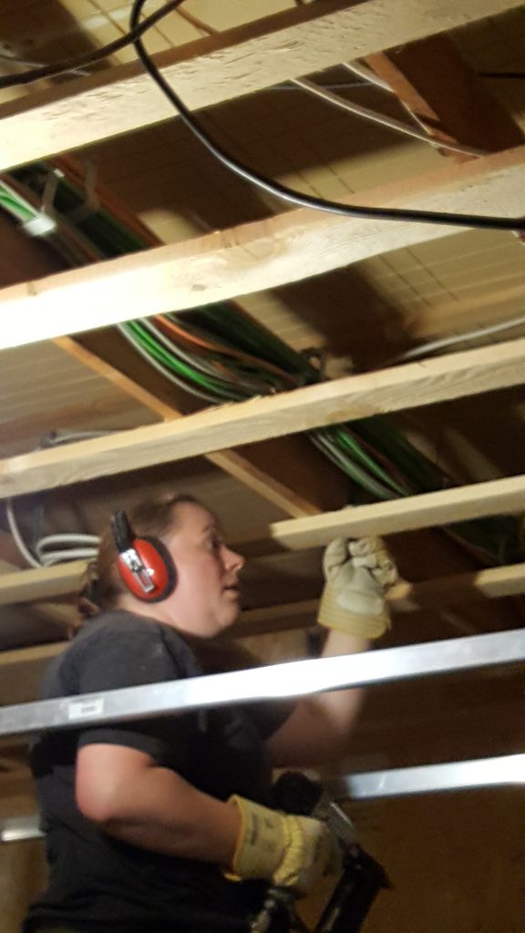 Lucia bei der Montage der Querträger auf dem Gerüst