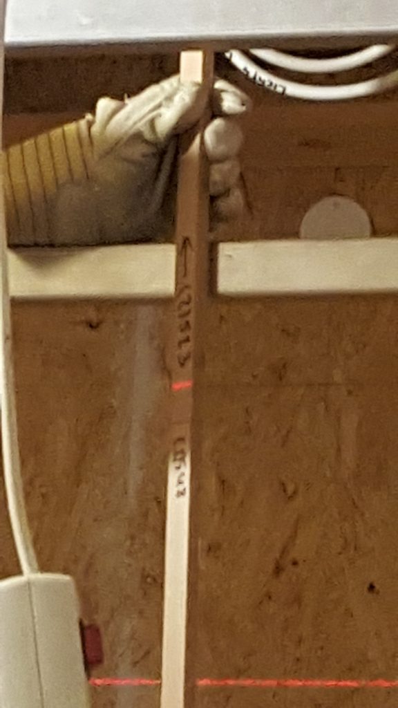 Exaktes Ausrichten der Unterkante aller Querlatten auf OKFF+2523mm, hier mit einem Maßholz und Nivellier-LASER auf OKFF+2000mm