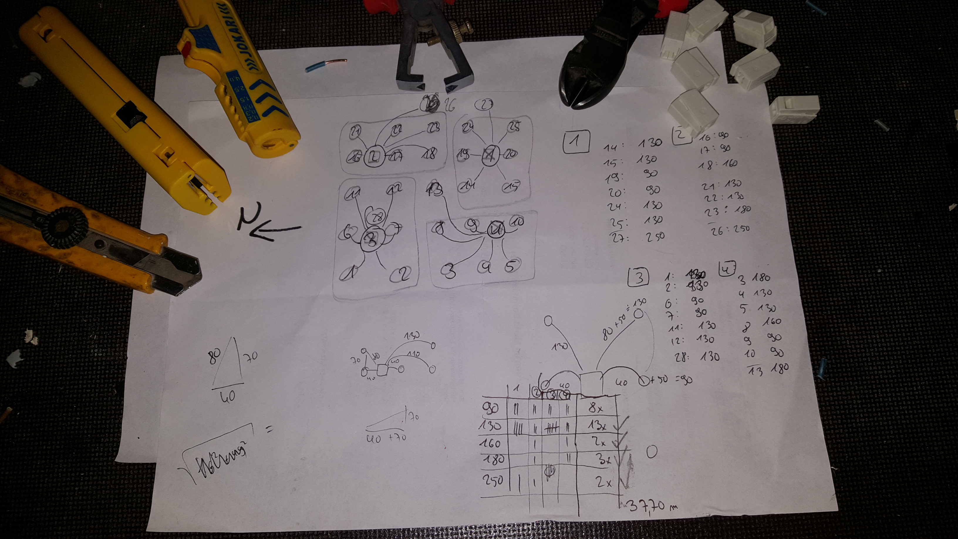 Kabellängen für die vier Lichtverteiler, jeweils die Distanzen zwischen den Verteilern und den Positionen der Leuchten