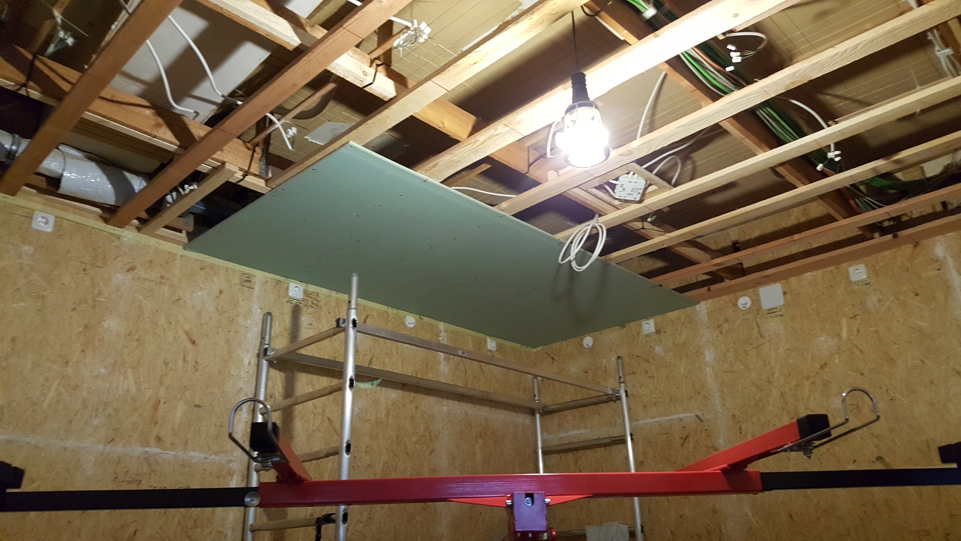 Erste Rigipsplatte (2,5 x 1,25m²) installiert