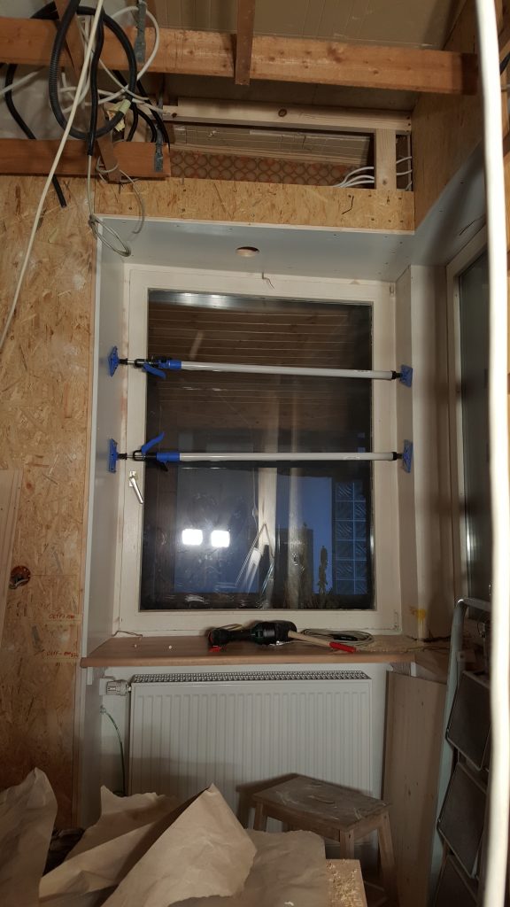 Linke Fensterlaibung verkleidet mit Holz, schraubt und geklebt, die Stützen pressen die Holzplatte in Form, da der Untergrund der Fensterlaibung nicht ganz eben ist