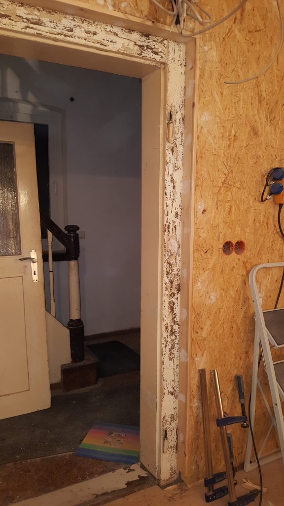 Küchentür, Rahmen abgeschliffen, Anschluss zur Wand angeschraubt