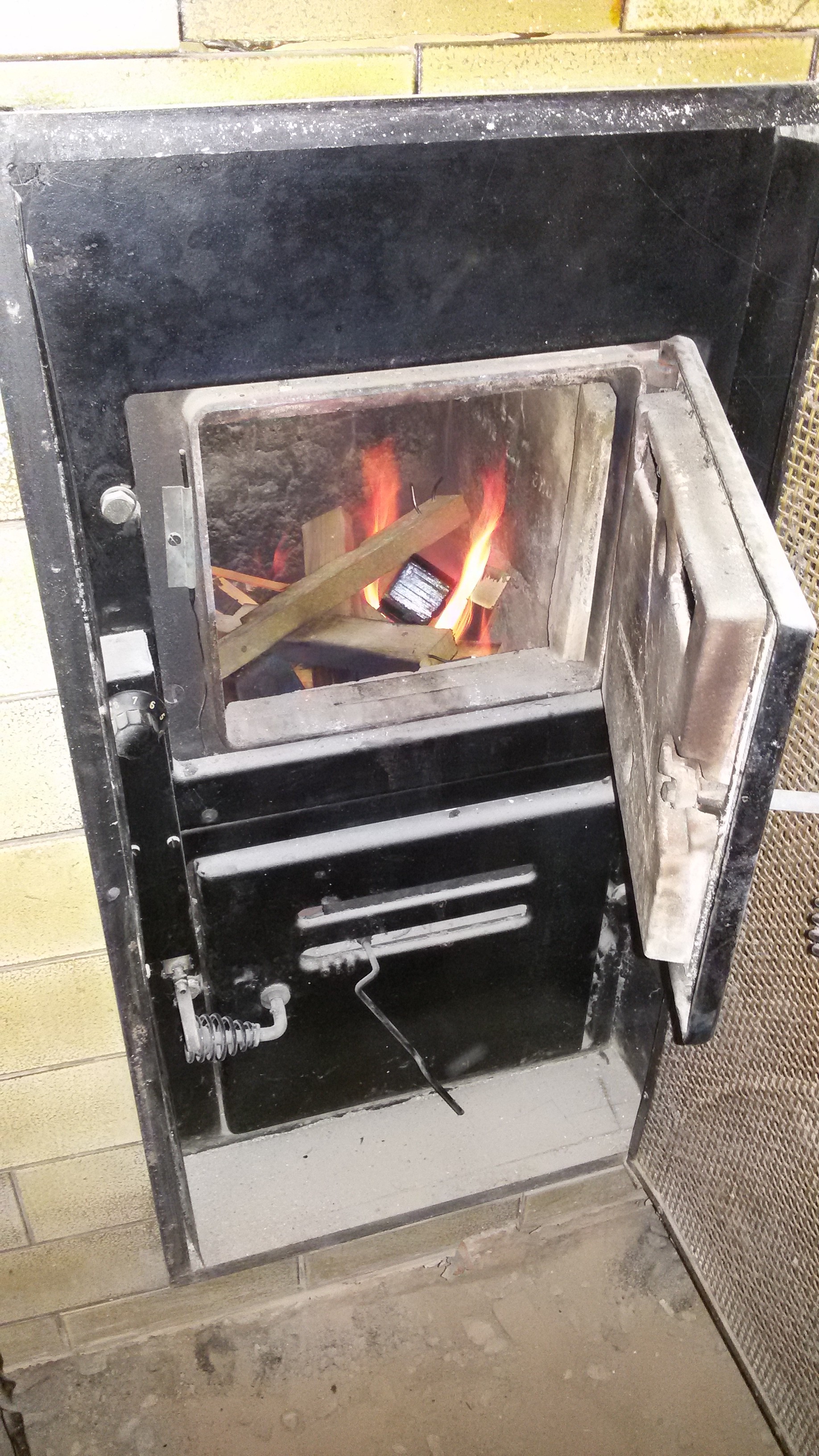 Kachelofen in Betrieb, von der Küche aus gesehen