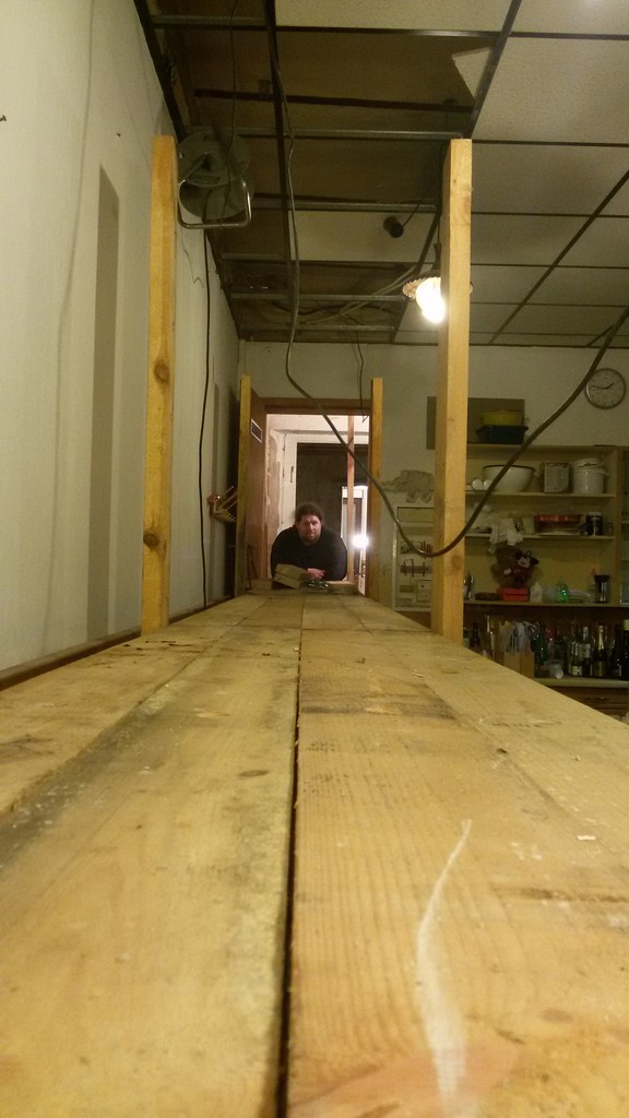 Gerüst in der ehemaligen Weinstube zwecks Leitungsinstallation in der Zwischendecke, Blick durch die Speisekammer in die Küche und Wohnzimmer im Hintergrund