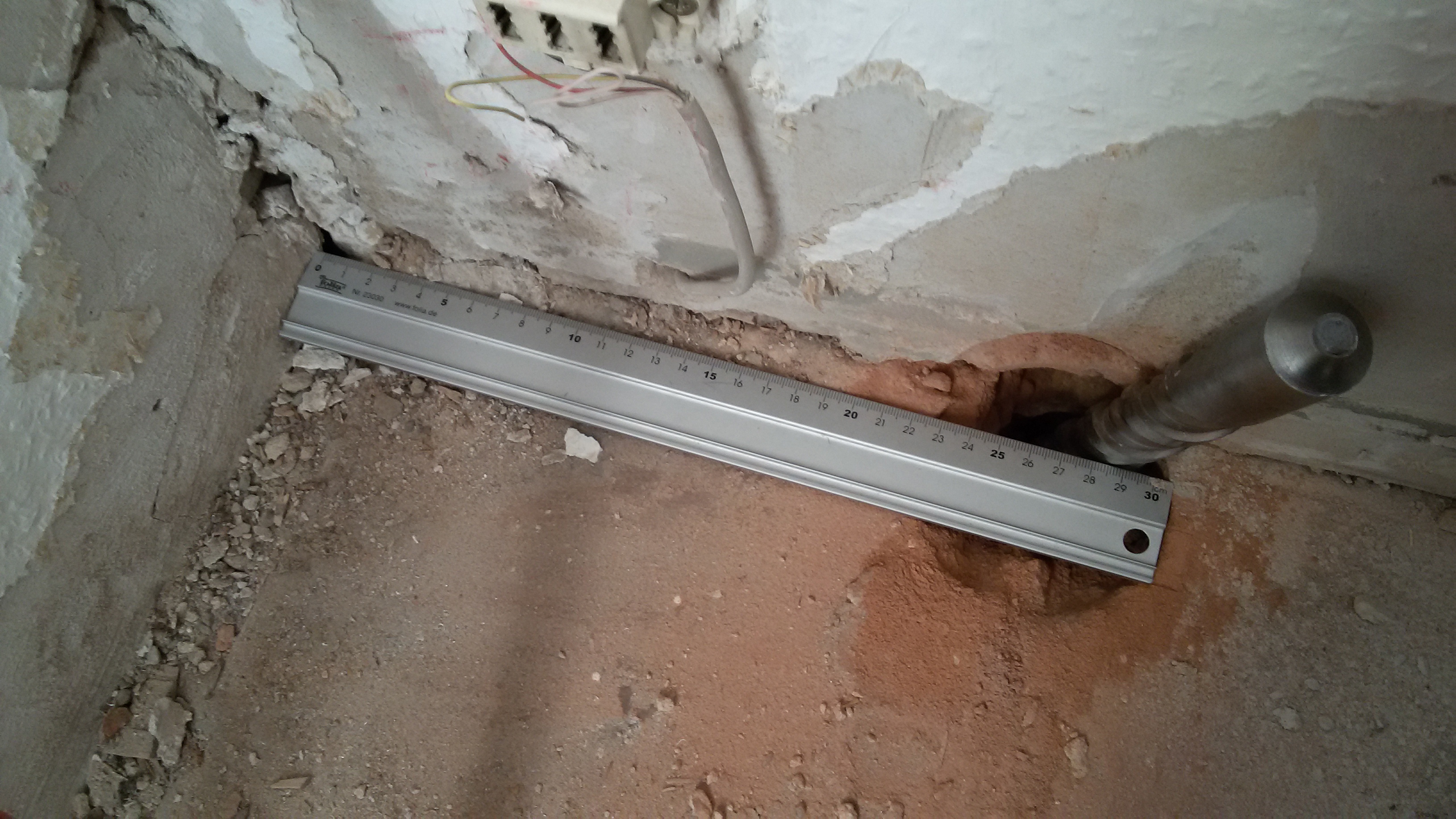 Deckendurchbruch #11 vom Flur (OG) aus gesehen. Die Bohrung ist rund 29cm von der Außenwand entfernt. Im Wohnzimmer (darunter) ist die gleiche Bohrung nur rund 8cm von der Außenwand entfernt.