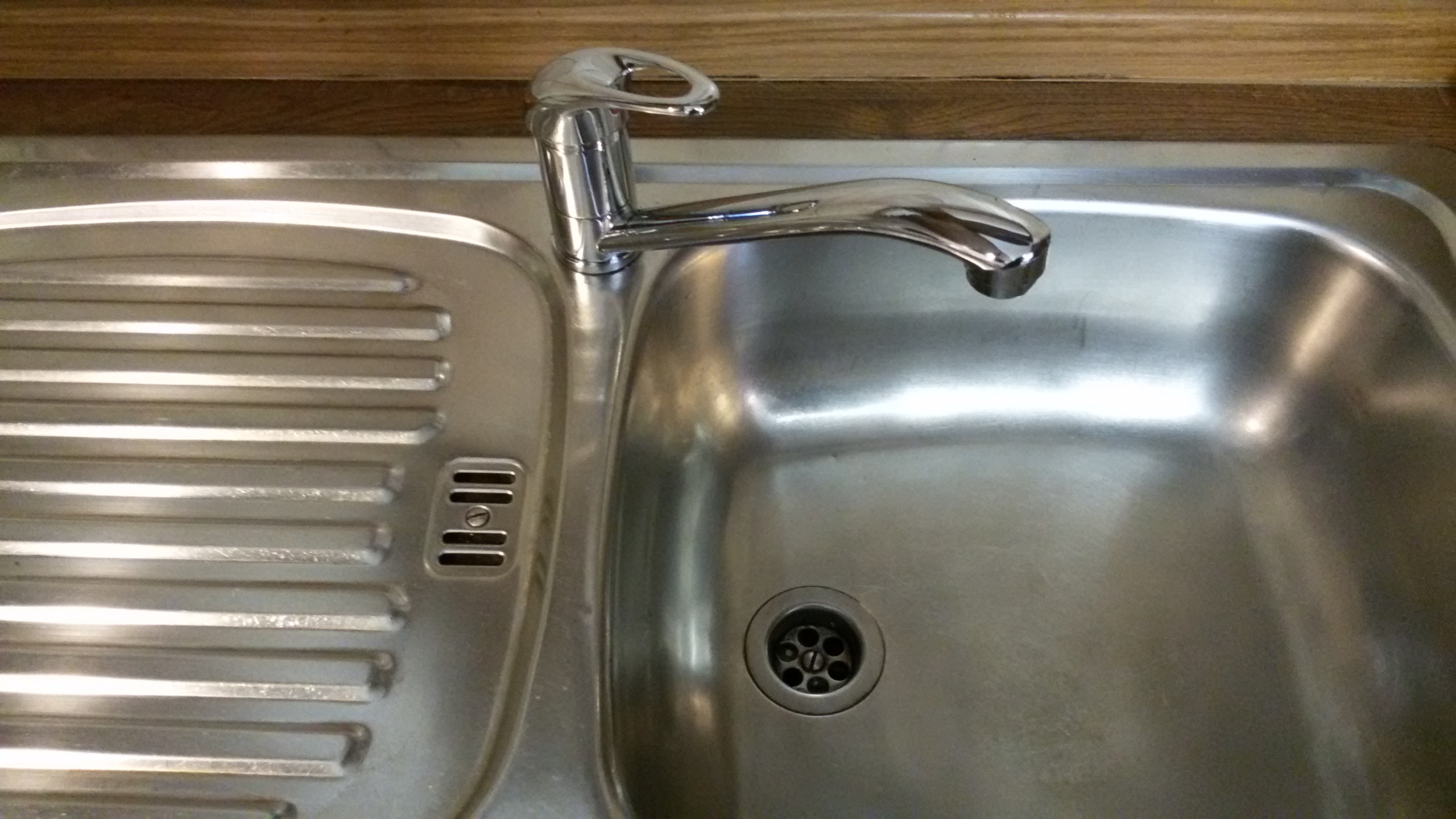 Neuer Wasserhahn in provisorischer Küche. Der alte war undicht.