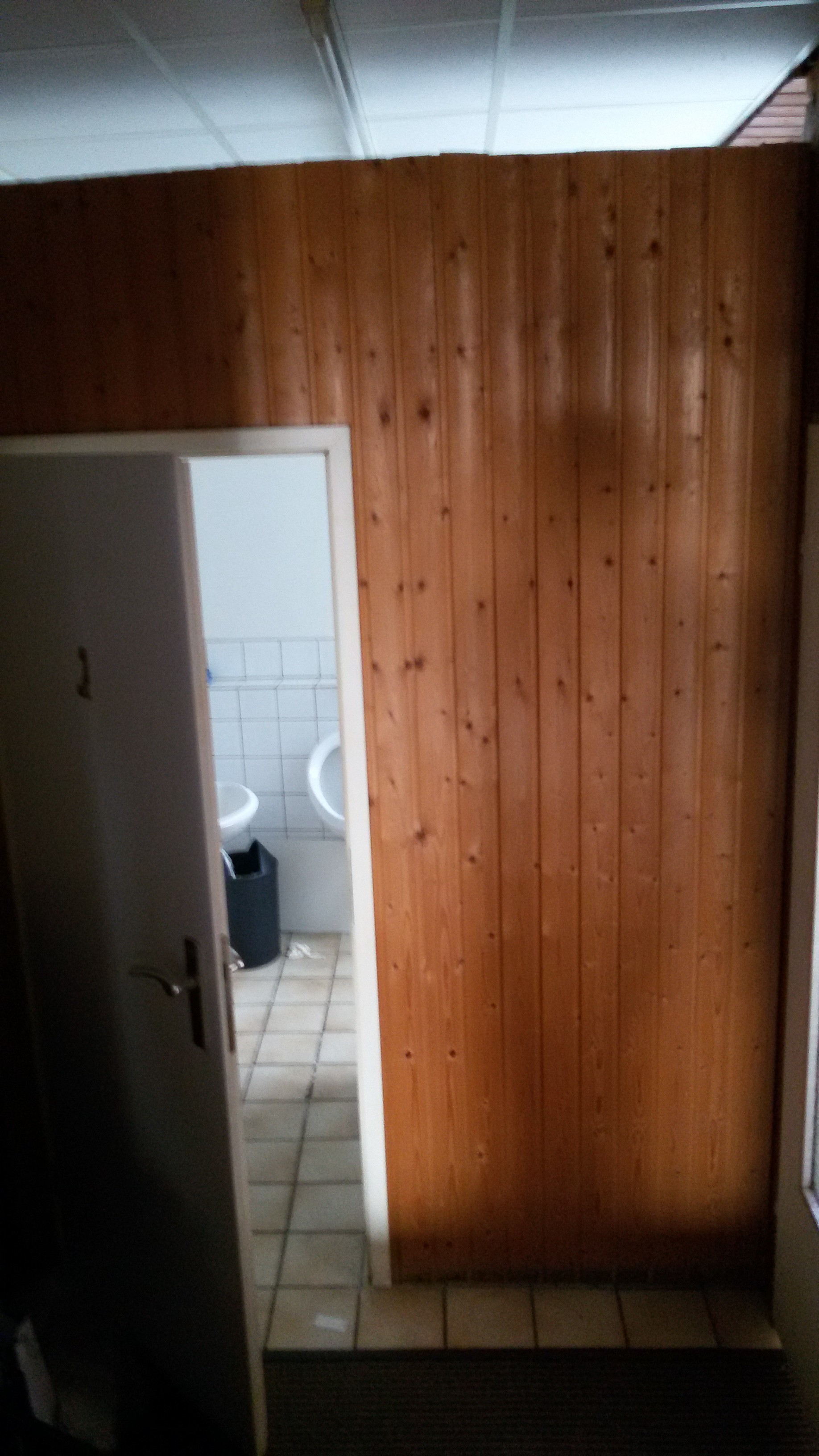 Blick vom Flur im Hauswirtschaftsraum zum etwas tiefer gelegenen ehem. Herren-WC (vor dem Abriss der Trennwand)