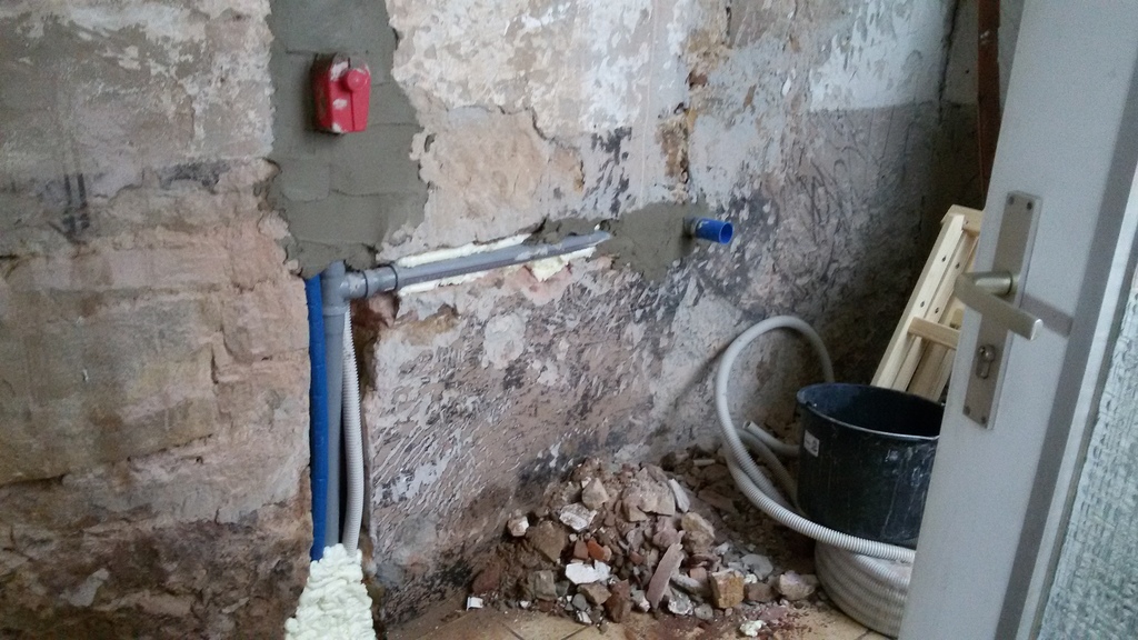 5/2015: Wasserleitungen und Abwasserrohre verlegt und vermörtelt