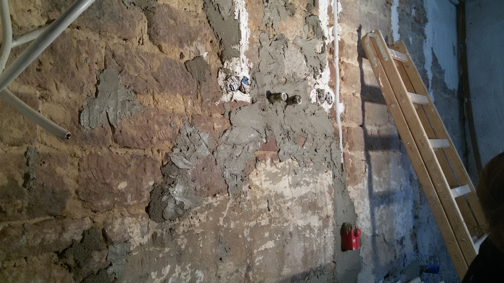 Größere Löcher in der Wand mit Kalkzementputz füllen