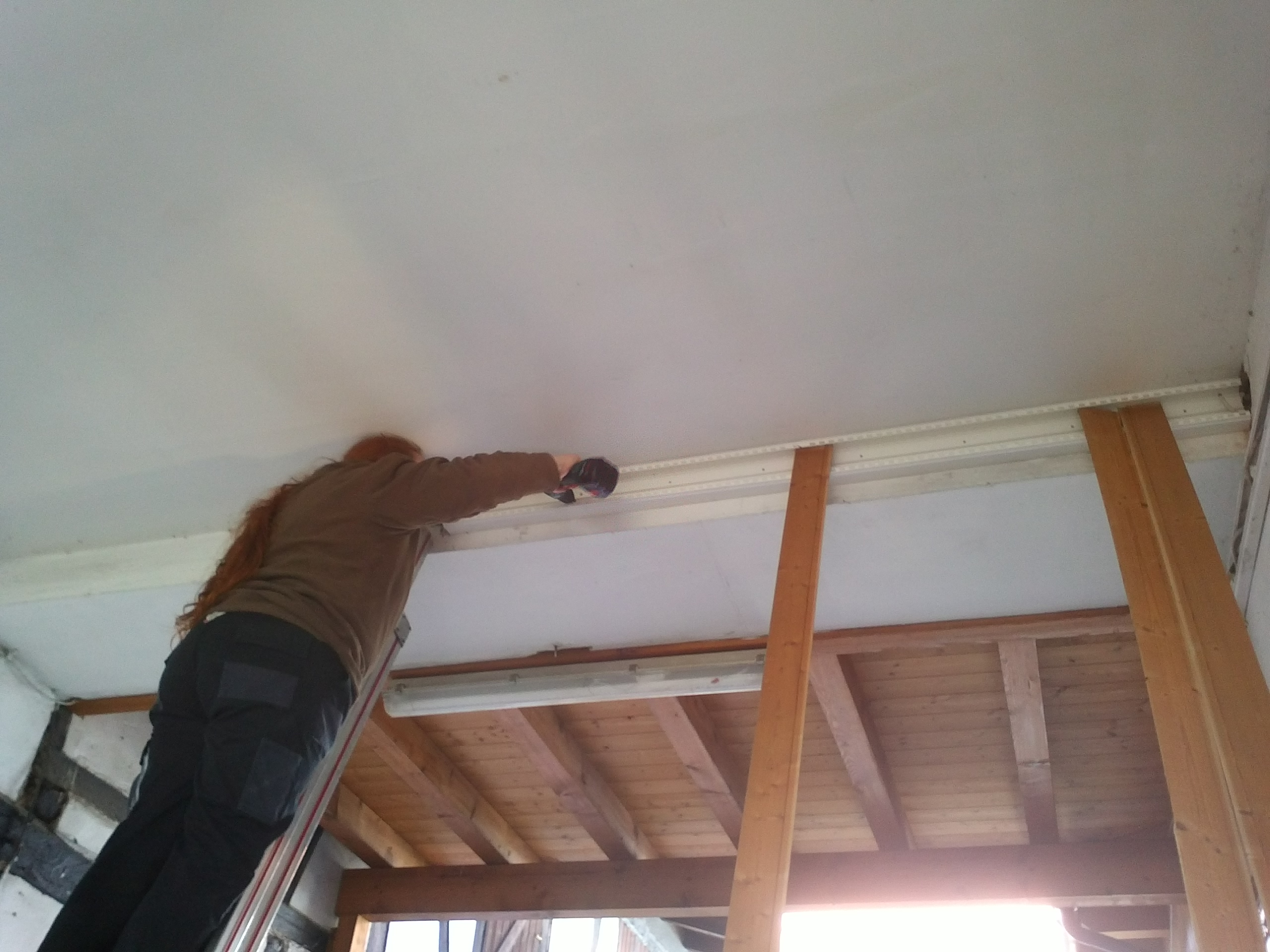Lucia beim Anbringen des Kabelkanals quer über den Hof in knapp 4m Höhe.