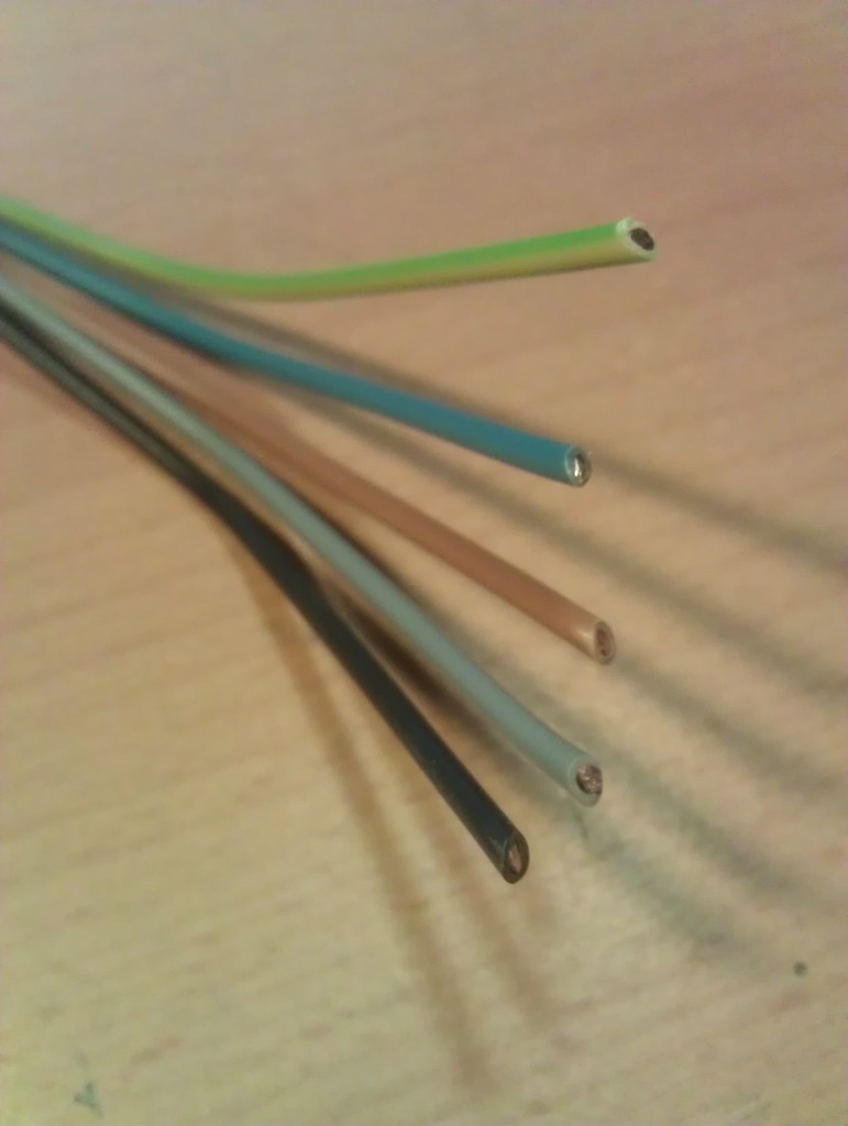 NYM-J 5×1,5mm² mit den Aderfarben schwarz (L2), grau (L3), braun (L1), blau (N) und grün-gelb (PE)