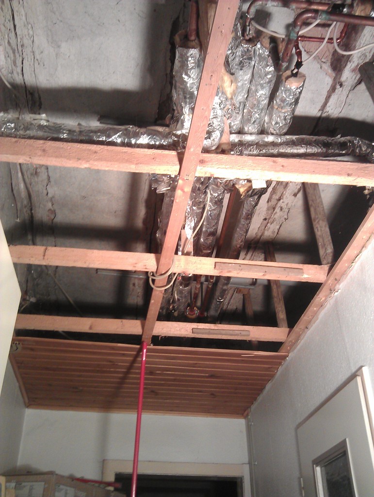 Zwischendecke im Flur Hauswirtschaftsbereich, von der Eingangstür her gesehen, Decke aufgerissen am 21.3.2015