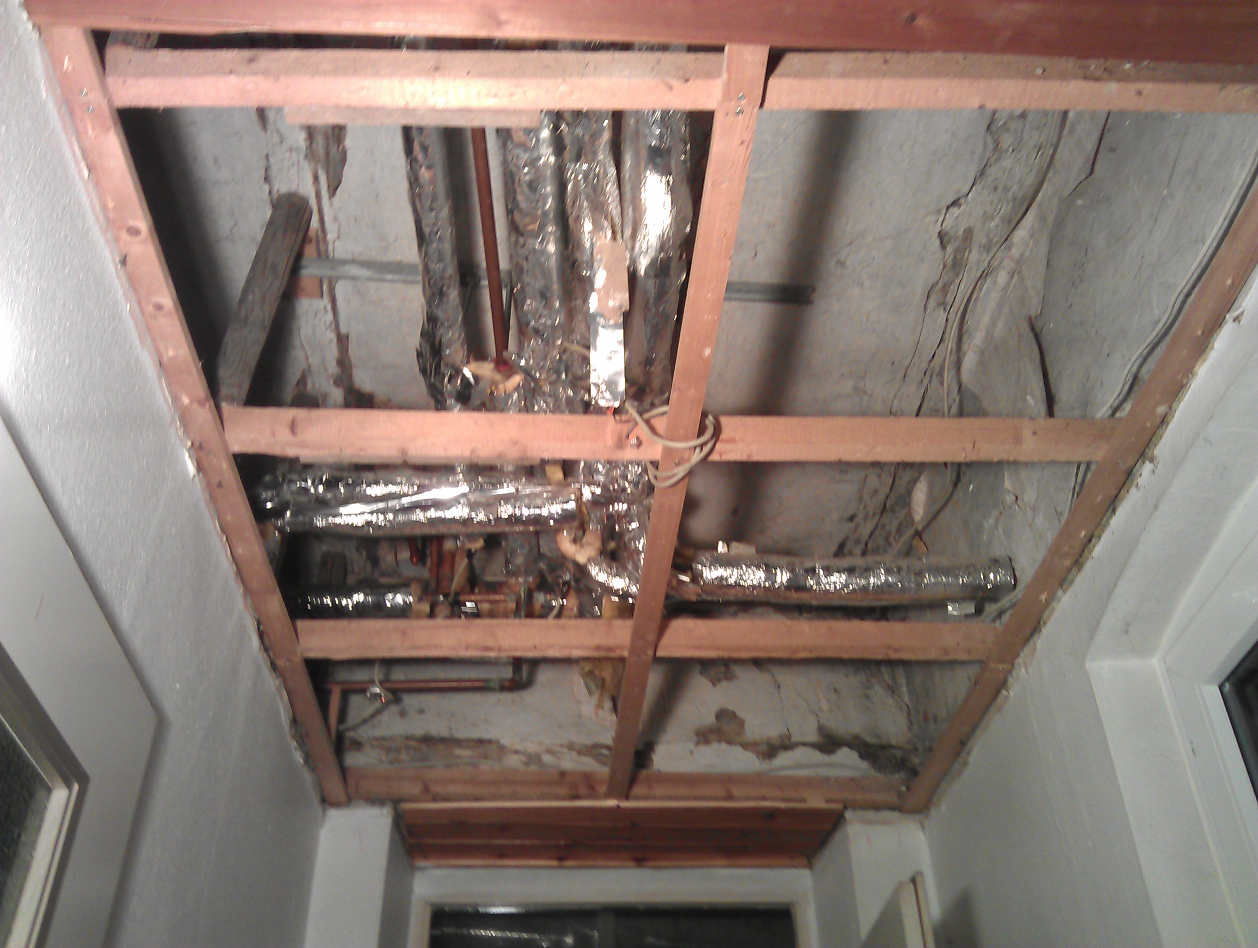 Zwischendecke im Flur Hauswirtschaftsbereich, vom Heizungsraum her gesehen, Decke aufgerissen am 21.3.2015