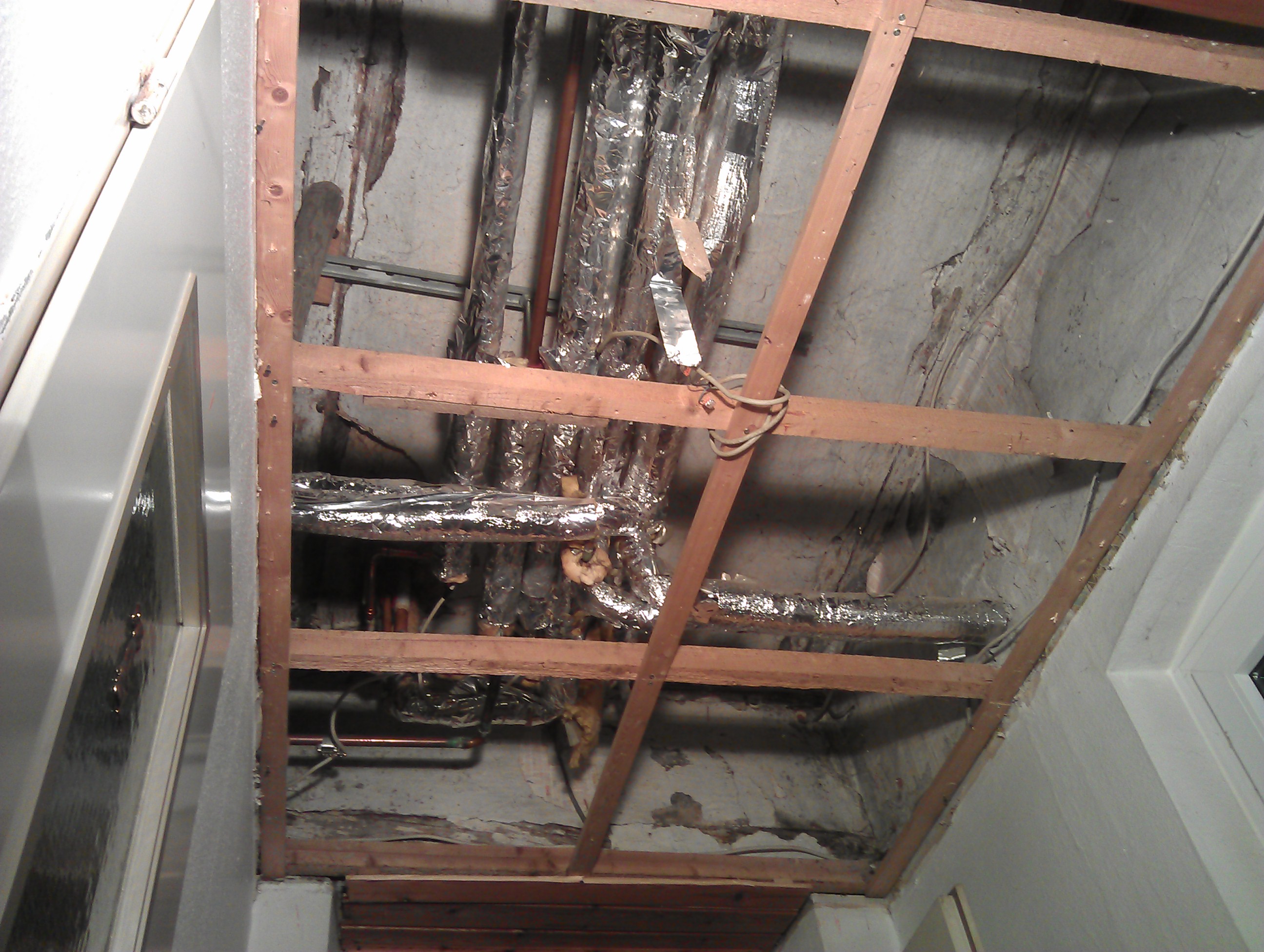 Zwischendecke im Flur Hauswirtschaftsbereich, vom Heizungsraum her gesehen, Decke aufgerissen am 21.3.2015