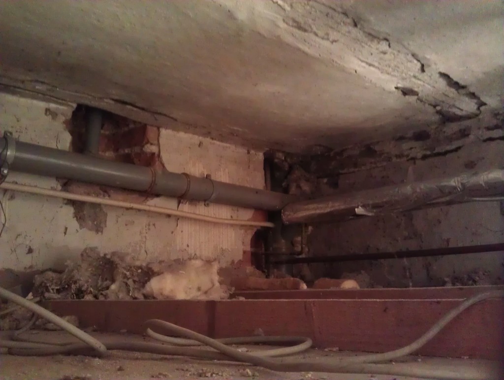 * hinten rechts: Dickes Abflussrohr unter der Dusche, hier auch Toilette und Zuleitungen für Wasser im Badezimmer oben